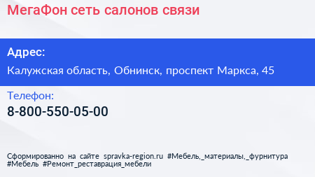 МегаФон, сеть салонов связи по адресу Калужская область, Обнинск, проспект Маркса, 45 в дальнейшем Организация, размещена в следующих категориях: