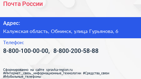 Почта России по адресу Калужская область, Обнинск, улица Гурьянова, 6 в дальнейшем Организация, размещена в следующих категориях: