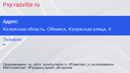 Psy-razvitie.ru по адресу Калужская область, Обнинск, Калужская улица, 4 в дальнейшем Организация, размещена в следующих категориях: