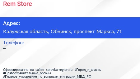 Rem Store по адресу Калужская область, Обнинск, проспект Маркса, 71 в дальнейшем Организация, размещена в следующих категориях: