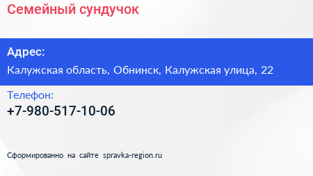 Семейный сундучок по адресу Калужская область, Обнинск, Калужская улица, 22 в дальнейшем Организация, размещена в следующих категориях:
