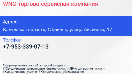 WNC, торгово-сервисная компания по адресу Калужская область, Обнинск, улица Аксёнова, 17 в дальнейшем Организация, размещена в следующих категориях: