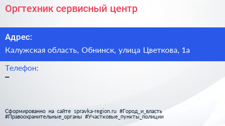 Оргтехник, сервисный центр по адресу Калужская область, Обнинск, улица Цветкова, 1а в дальнейшем Организация, размещена в следующих категориях: