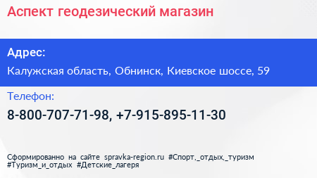 Аспект, геодезический магазин по адресу Калужская область, Обнинск, Киевское шоссе, 59 в дальнейшем Организация, размещена в следующих категориях: