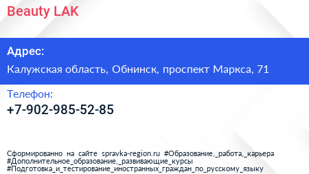 Beauty LAK по адресу Калужская область, Обнинск, проспект Маркса, 71 в дальнейшем Организация, размещена в следующих категориях: