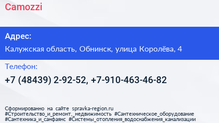 Camozzi по адресу Калужская область, Обнинск, улица Королёва, 4 в дальнейшем Организация, размещена в следующих категориях: