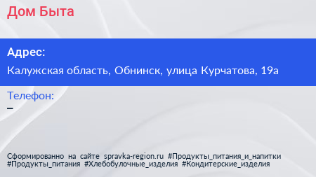 Дом Быта по адресу Калужская область, Обнинск, улица Курчатова, 19а в дальнейшем Организация, размещена в следующих категориях: