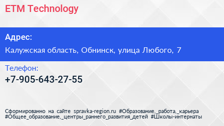 ETM Technology по адресу Калужская область, Обнинск, улица Любого, 7 в дальнейшем Организация, размещена в следующих категориях: