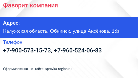 Фаворит, компания по адресу Калужская область, Обнинск, улица Аксёнова, 16а в дальнейшем Организация, размещена в следующих категориях: