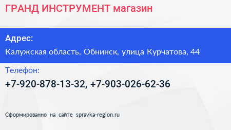 ГРАНД ИНСТРУМЕНТ, магазин по адресу Калужская область, Обнинск, улица Курчатова, 44 в дальнейшем Организация, размещена в следующих категориях:
