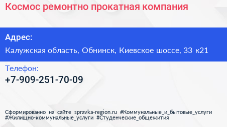 Космос, ремонтно-прокатная компания по адресу Калужская область, Обнинск, Киевское шоссе, 33 к21 в дальнейшем Организация, размещена в следующих категориях: