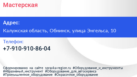Мастерская по адресу Калужская область, Обнинск, улица Энгельса, 10 в дальнейшем Организация, размещена в следующих категориях: