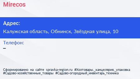 Mirecos по адресу Калужская область, Обнинск, Звёздная улица, 10 в дальнейшем Организация, размещена в следующих категориях: