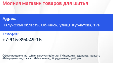 Молния, магазин товаров для шитья по адресу Калужская область, Обнинск, улица Курчатова, 19а в дальнейшем Организация, размещена в следующих категориях:
