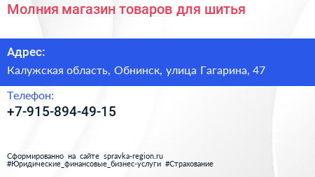 Молния, магазин товаров для шитья по адресу Калужская область, Обнинск, улица Гагарина, 47 в дальнейшем Организация, размещена в следующих категориях: