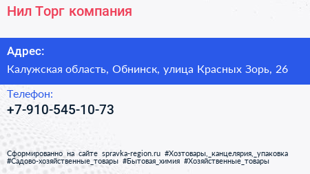 Нил Торг, компания по адресу Калужская область, Обнинск, улица Красных Зорь, 26 в дальнейшем Организация, размещена в следующих категориях: