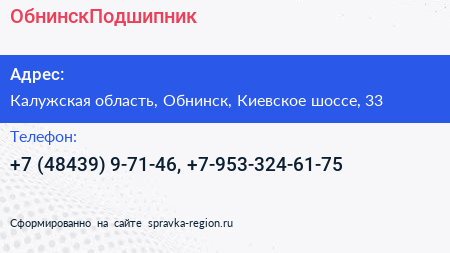 ОбнинскПодшипник по адресу Калужская область, Обнинск, Киевское шоссе, 33 в дальнейшем Организация, размещена в следующих категориях: