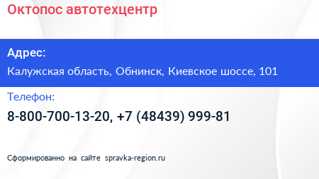 Октопос, автотехцентр по адресу Калужская область, Обнинск, Киевское шоссе, 101 в дальнейшем Организация, размещена в следующих категориях: