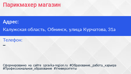 Парикмахер, магазин по адресу Калужская область, Обнинск, улица Курчатова, 31а в дальнейшем Организация, размещена в следующих категориях: