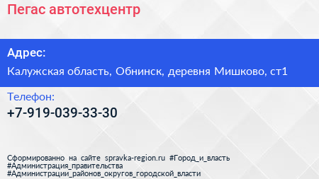 Пегас, автотехцентр по адресу Калужская область, Обнинск, деревня Мишково, ст1 в дальнейшем Организация, размещена в следующих категориях: