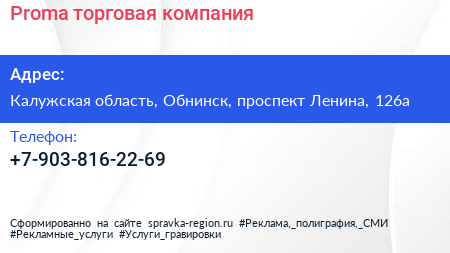 Proma, торговая компания по адресу Калужская область, Обнинск, проспект Ленина, 126а в дальнейшем Организация, размещена в следующих категориях: