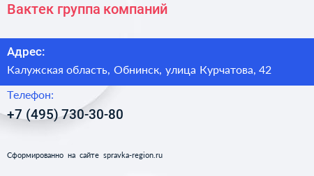 Вактек, группа компаний по адресу Калужская область, Обнинск, улица Курчатова, 42 в дальнейшем Организация, размещена в следующих категориях: