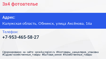 3х4, фотоателье по адресу Калужская область, Обнинск, улица Аксёнова, 16а в дальнейшем Организация, размещена в следующих категориях: