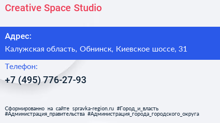 Creative Space Studio по адресу Калужская область, Обнинск, Киевское шоссе, 31 в дальнейшем Организация, размещена в следующих категориях: