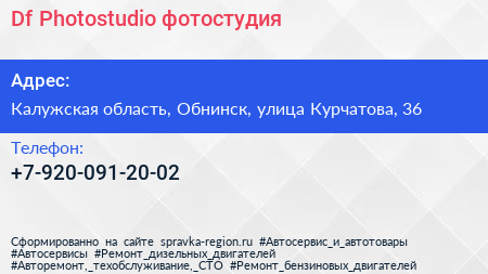 Df Photostudio, фотостудия по адресу Калужская область, Обнинск, улица Курчатова, 36 в дальнейшем Организация, размещена в следующих категориях: