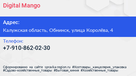 Digital Mango по адресу Калужская область, Обнинск, улица Королёва, 4 в дальнейшем Организация, размещена в следующих категориях: