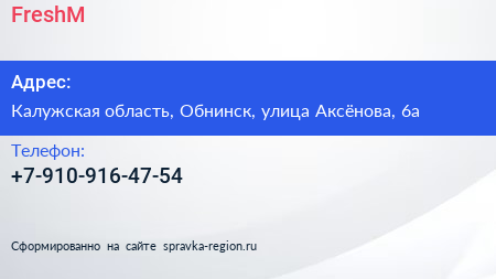 FreshM по адресу Калужская область, Обнинск, улица Аксёнова, 6а в дальнейшем Организация, размещена в следующих категориях: