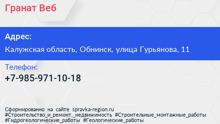 Гранат Веб по адресу Калужская область, Обнинск, улица Гурьянова, 11 в дальнейшем Организация, размещена в следующих категориях: