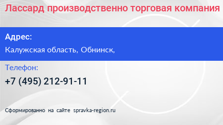 Лассард, производственно-торговая компания по адресу Калужская область, Обнинск, в дальнейшем Организация, размещена в следующих категориях: