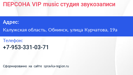 ПЕРСОНА VIP music, студия звукозаписи по адресу Калужская область, Обнинск, улица Курчатова, 19а в дальнейшем Организация, размещена в следующих категориях: