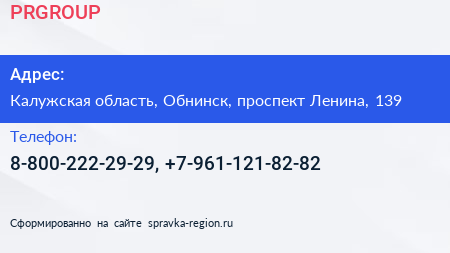 PRGROUP по адресу Калужская область, Обнинск, проспект Ленина, 139 в дальнейшем Организация, размещена в следующих категориях: