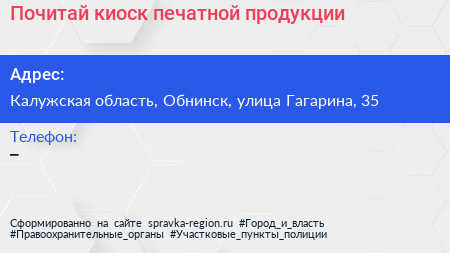 Почитай, киоск печатной продукции по адресу Калужская область, Обнинск, улица Гагарина, 35 в дальнейшем Организация, размещена в следующих категориях: