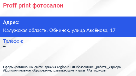 Proff print, фотосалон по адресу Калужская область, Обнинск, улица Аксёнова, 17 в дальнейшем Организация, размещена в следующих категориях:
