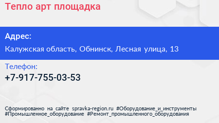 Тепло, арт-площадка по адресу Калужская область, Обнинск, Лесная улица, 13 в дальнейшем Организация, размещена в следующих категориях: