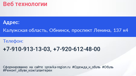 Веб-технологии по адресу Калужская область, Обнинск, проспект Ленина, 137 к4 в дальнейшем Организация, размещена в следующих категориях: