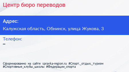 Центр, бюро переводов по адресу Калужская область, Обнинск, улица Жукова, 3 в дальнейшем Организация, размещена в следующих категориях: