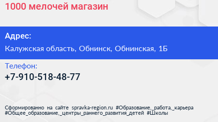 1000 мелочей, магазин по адресу Калужская область, Обнинск, Обнинская, 1Б в дальнейшем Организация, размещена в следующих категориях: