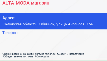 ALTA MODA, магазин по адресу Калужская область, Обнинск, улица Аксёнова, 16а в дальнейшем Организация, размещена в следующих категориях: