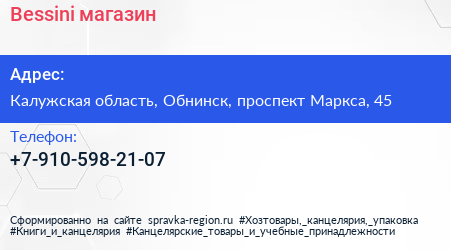 Bessini, магазин по адресу Калужская область, Обнинск, проспект Маркса, 45 в дальнейшем Организация, размещена в следующих категориях: