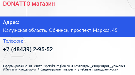 DONATTO, магазин по адресу Калужская область, Обнинск, проспект Маркса, 45 в дальнейшем Организация, размещена в следующих категориях: