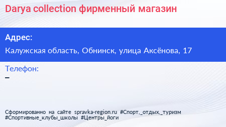 Darya collection, фирменный магазин по адресу Калужская область, Обнинск, улица Аксёнова, 17 в дальнейшем Организация, размещена в следующих категориях: