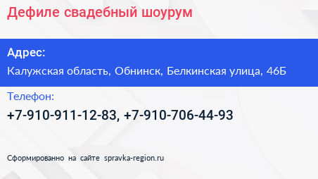 Дефиле, свадебный шоурум по адресу Калужская область, Обнинск, Белкинская улица, 46Б в дальнейшем Организация, размещена в следующих категориях: