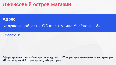 Джинсовый остров, магазин по адресу Калужская область, Обнинск, улица Аксёнова, 16а в дальнейшем Организация, размещена в следующих категориях: