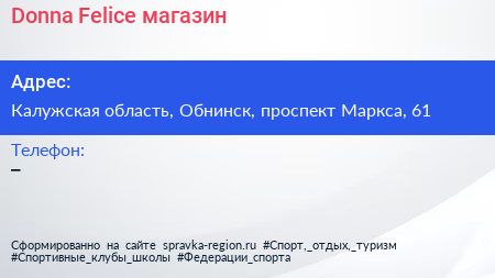 Donna Felice, магазин по адресу Калужская область, Обнинск, проспект Маркса, 61 в дальнейшем Организация, размещена в следующих категориях: