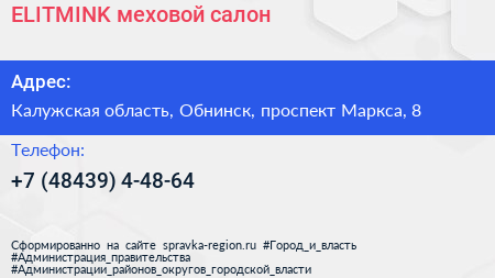 ELITMINK, меховой салон по адресу Калужская область, Обнинск, проспект Маркса, 8 в дальнейшем Организация, размещена в следующих категориях: