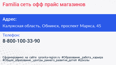 Familia, сеть офф-прайс магазинов по адресу Калужская область, Обнинск, проспект Маркса, 45 в дальнейшем Организация, размещена в следующих категориях: